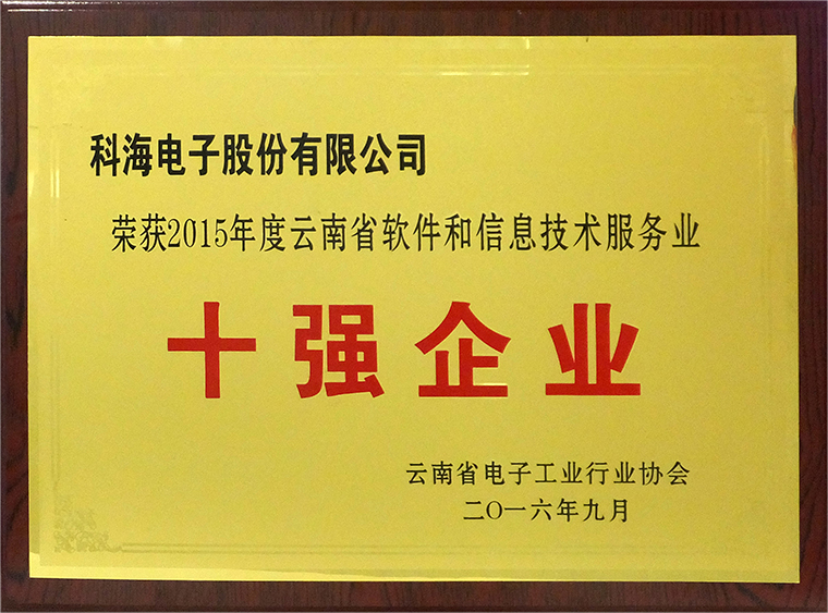 九月,一個(gè)收獲的季節(jié),公司榮獲了云南省電子工業(yè)行業(yè)協(xié)會(huì)頒發(fā)的“2015年度云南省軟件和信息技術(shù)服務(wù)業(yè)十強(qiáng)企業(yè)”的榮譽(yù)稱號(hào)。