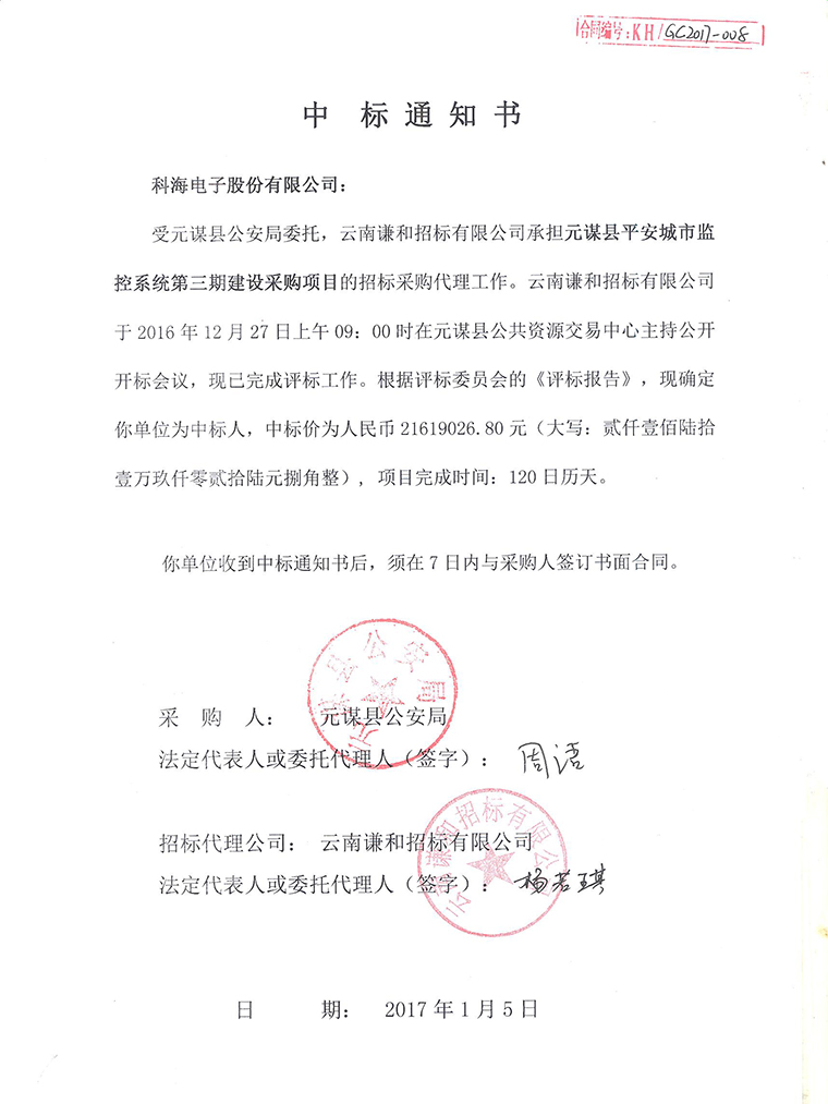 正值寒冬季節(jié),美麗的昆明依然陽(yáng)光普照、溫暖如春,我公司也如同這燦爛的天氣一般,在年末收官之際頻獲喜訊。科海電子股份有限公司再次憑借著雄厚的技術(shù)力量和良好的信譽(yù)于2016年12月28日順利中標(biāo)“元謀縣平安城市控系統(tǒng)第三期建設(shè)采購(gòu)項(xiàng)目”,中標(biāo)金額:21619026.80元。